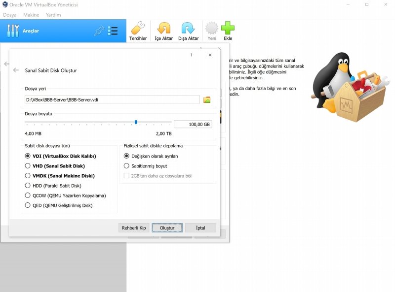 Şimdilik deneme olsun diye sunucumu sanal bilgisayara kuracağım. Oluşturacağım sunucu için Virtual Box programını https://www.virtualbox.org/wiki/Downloads adresinden indirip kurduktan sonra çalıştırdım. Daha sonra gerçekleştirmeyi düşündüğüm 2. senaryoya da hazır olması için 64 Bit Ubuntu üzerine yeni bir makine oluşturalım.