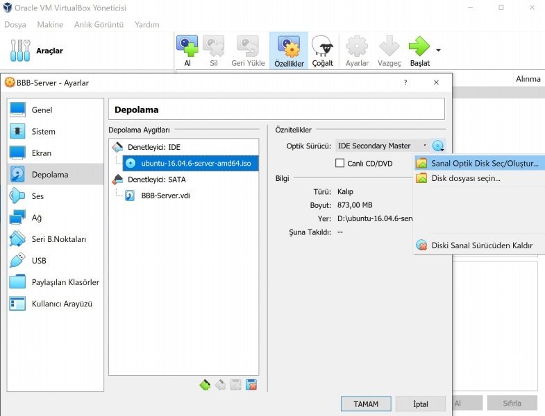 https://releases.ubuntu.com/16.04/ubuntu-16.04.6-desktop-amd64.iso adresinden indirdiğim dosyayı sanal optik disk olarak kullanıp kurulum yapmak için kullanacağım. Bu ekranda IDE denetleyici bölümünden "Disk dosyası seçin..." düğmesi ile indirdiğiniz ubuntu iso dosyasını seçmeniz lazım. Ubuntu Server kurulumu bittiğinde bu ekrana dönüp "Diski sanal sürücüden kaldır" seçeneğini seçmeyi unutmayın.