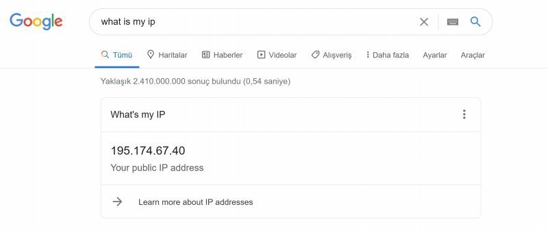 Modemimin arayüzünden veya veya basit bir web araması ile dış dünyaya açılan ip adresimi öğreniyorum.